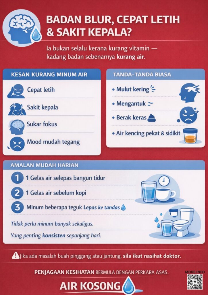 bila pengambilan air tidak mencukupi, badan boleh jadi cepat penat, sukar fokus dan mudah rasa tidak selesa. ramai yang terus fikir perlu tambah supplement, sedangkan keperluan asas badan belum dipenuhi.