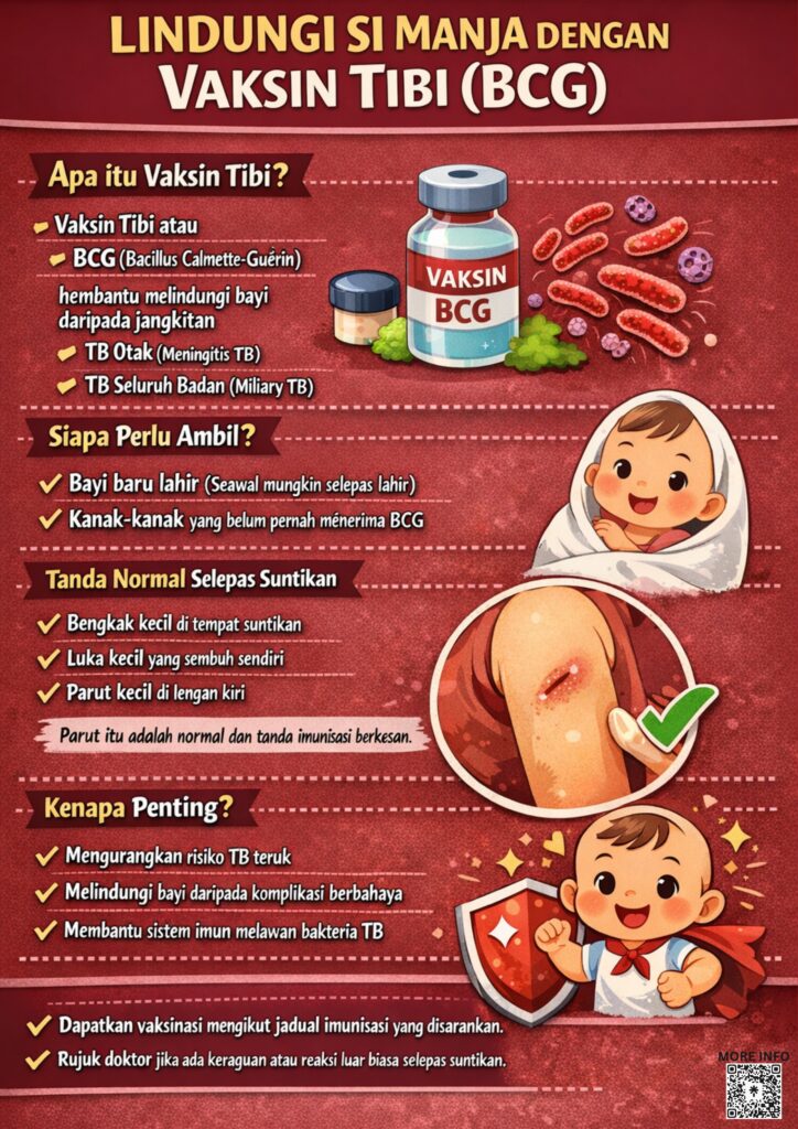Setiap bayi berhak membesar dengan perlindungan terbaik. Vaksin Tibi (BCG) membantu mengurangkan risiko jangkitan TB yang boleh membawa komplikasi serius seperti TB otak dan jangkitan seluruh badan.